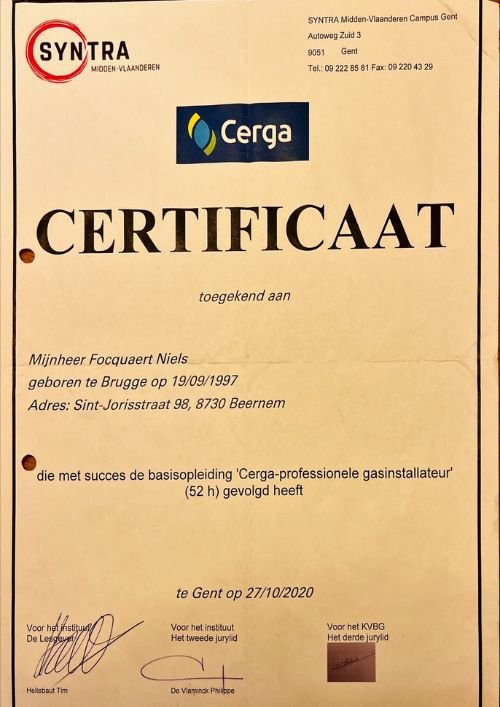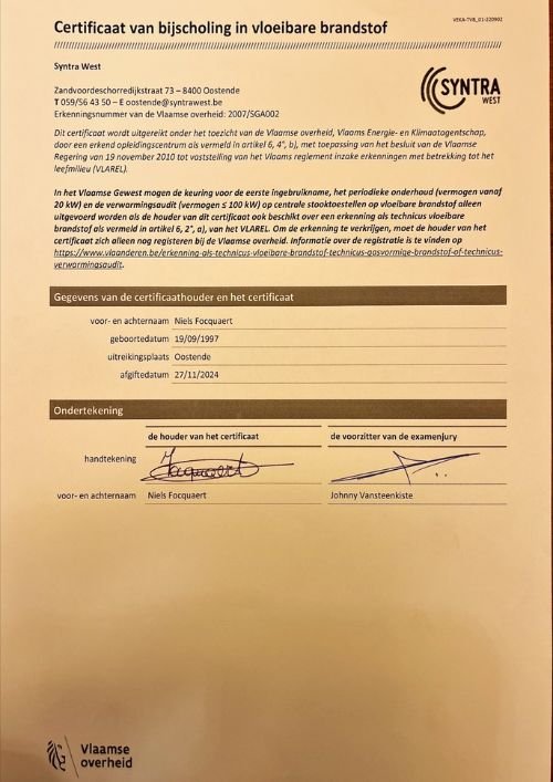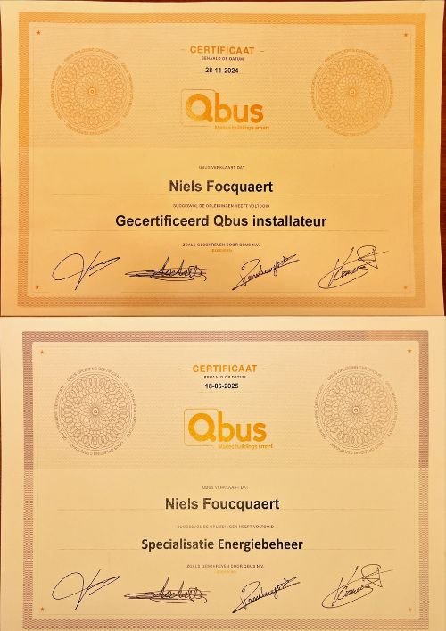 Naast jaren praktijkervaring blijft Niels zich voortdurend bijscholen om op de hoogte te blijven van de nieuwste technieken en installaties. Hij is professioneel geschoold op vlak van mazout, gas, pv-panelen en Qbus. Hij behaalde recent onder andere volgende certificaten: